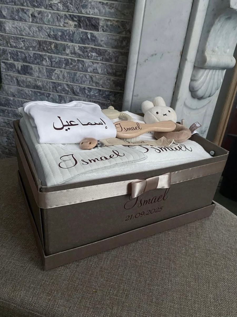 coffret naissance avec couverture, body, attache tétine, jouet, doudou, brosse.
